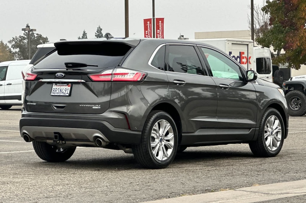 Lithia Ford and Lincoln of Fresno is pleased to offer this Magnetic 2020 Ford Edge Titanium for purchase, this vehicle is well equipped with many features including: Class II Trailer Tow Package, Equipment Group 301A (Adaptive Cruise Control w/Stop & Go, Adaptive LED Headlamps, Auto-Dimming Drivers Sideview Mirror, Enhanced Active Park Assist, Evasive Steering Assist, Front 180-Degree Camera w/Split View & Washer, Heated Rear Seats, Lane Centering, Leather-Trimmed Heated/Cooled Sport Bucket Seats, Panoramic Vista Roof, SiriusXM Traffic & Travel Link, and Voice-Activated Touchscreen Navigation System), Ford Certified, AWD, 12 Speakers, 3.80 Axle Ratio, 4-Wheel Disc Brakes, ABS brakes, Air Conditioning, Alloy wheels, AM/FM radio: SiriusXM, Auto High-beam Headlights, Auto tilt-away steering wheel, Auto-dimming Rear-View mirror, Automatic temperature control, Brake assist, Bumpers: body-color, Compass, Delay-off headlights, Driver door bin, Driver vanity mirror, Dual front impact airbags, Dual front side impact airbags, Electronic Stability Control, Emergency communication system: SYNC 3 911 Assist, FordPass Connect, Four wheel independent suspension, Front & Rear Floor Liners, Front anti-roll bar, Front Bucket Seats, Front Center Armrest w/Storage, Front dual zone A/C, Front fog lights, Front reading lights, Fully automatic headlights, Garage door transmitter, Heated door mirrors, Heated front seats, Heated steering wheel, Illuminated entry, Knee airbag, Leather-Trimmed Heated Sport Bucket Seats, Low tire pressure warning, Memory seat, Occupant sensing airbag, Outside temperature display, Overhead airbag, Overhead console, Panic alarm, Passenger door bin, Passenger vanity mirror, Power door mirrors, Power driver seat, Power Liftgate, Power passenger seat, Power steering, Power windows, Radio: B&O Sound System by Bang & Olufsen, Rain sensing wipers, Rear anti-roll bar, Rear reading lights, Rear seat center armrest, Rear window defroster, Rear window wiper, Remote keyless entry, Roof rack: rails only, Security system, SiriusXM Radio, Speed control, Speed-Sensitive Wipers, Split folding rear seat, Spoiler, Steering wheel memory, Steering wheel mounted audio controls, SYNC 3 Communications & Entertainment System, Tachometer, Telescoping steering wheel, Tilt steering wheel, Traction control, Trip computer, Turn signal indicator mirrors, Variably intermittent wipers, and Wheels: 19 Luster Nickel-Painted Aluminum. AWD EcoBoost 2.0L I4 GTDi DOHC Turbocharged VCT 8-Speed Automatic Titanium