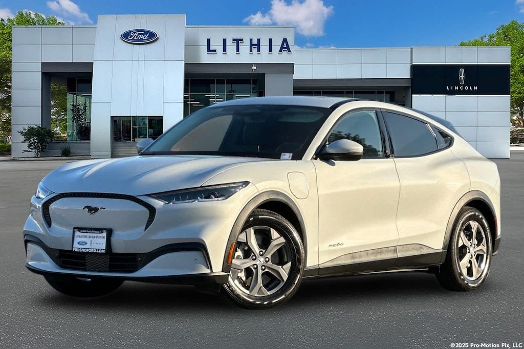 Lithia Ford and Lincoln of Fresno is pleased to offer this White 2021 Ford Mustang Mach-E Select for purchase, this vehicle is well equipped with many features including: Equipment Group 100A, Interior Protection Package (Pre-Installed) (Cargo Area Protector and Front & Rear Floor Liners), 4-Wheel Disc Brakes, 6 Speakers, ABS brakes, ActiveX Bucket Seats, Air Conditioning, Alloy wheels, AM/FM radio: SiriusXM, AM/FM Stereo, Apple CarPlay/Android Auto, Auto High-beam Headlights, Auto-dimming Rear-View mirror, Automatic temperature control, Axle Ratio: 9.05, Brake assist, Bumpers: body-color, Compass, Delay-off headlights, Driver door bin, Driver vanity mirror, Dual front impact airbags, Dual front side impact airbags, Electronic Stability Control, Emergency communication system: 911 Assist, Exterior Parking Camera Rear, Four wheel independent suspension, Front anti-roll bar, Front Bucket Seats, Front Center Armrest, Front dual zone A/C, Front reading lights, Fully automatic headlights, Garage door transmitter, Heated door mirrors, Illuminated entry, Knee airbag, Low tire pressure warning, Navigation system: Connected Navigation, Occupant sensing airbag, Outside temperature display, Overhead airbag, Overhead console, Panic alarm, Passenger door bin, Passenger vanity mirror, Power door mirrors, Power driver seat, Power steering, Power windows, Radio data system, Rain sensing wipers, Rear anti-roll bar, Rear seat center armrest, Rear side impact airbag, Rear window defroster, Rear window wiper, Remote keyless entry, Security system, SiriusXM Radio w/360L, Speed control, Speed-sensing steering, Speed-Sensitive Wipers, Split folding rear seat, Spoiler, Steering wheel mounted audio controls, SYNC 4A w/Enhanced Voice Recognition, Telescoping steering wheel, Tilt steering wheel, Traction control, Trip computer, Turn signal indicator mirrors, Variably intermittent wipers, and Wheels: 18 Carbonized Gray-Painted Aluminum. RWD Dual Electric Motor Single-Speed Automatic Select