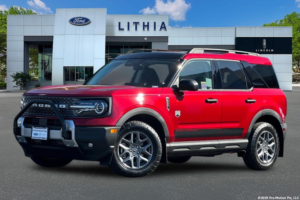 Lithia Ford and Lincoln of Fresno is pleased to offer this Ruby Red Metallic Tinted Clearcoat 2025 Ford Bronco Sport Big Bend for purchase, this vehicle is well equipped with many features including: 4-Wheel Disc Brakes, 6 Speakers, ABS brakes, Air Conditioning, Alloy wheels, AM/FM radio: SiriusXM, AM/FM Stereo, Auto High-beam Headlights, Automatic temperature control, Brake assist, Cloth w/Easy-to-Clean Front Bucket Seats, Compass, Delay-off headlights, Driver door bin, Driver vanity mirror, Dual front impact airbags, Dual front side impact airbags, Electronic Stability Control, Emergency communication system: SYNC 4 911 Assist, Four wheel independent suspension, Front anti-roll bar, Front Bucket Seats, Front Center Armrest, Front reading lights, Fully automatic headlights, Heated door mirrors, Illuminated entry, Knee airbag, Low tire pressure warning, Occupant sensing airbag, Outside temperature display, Overhead airbag, Overhead console, Panic alarm, Passenger door bin, Passenger vanity mirror, Power door mirrors, Power steering, Power windows, Radio data system, Rear anti-roll bar, Rear Parking Sensors, Rear reading lights, Rear seat center armrest, Rear window defroster, Rear window wiper, Remote keyless entry, Security system, SiriusXM, Speed control, Speed-sensing steering, Speed-Sensitive Wipers, Split folding rear seat, Steering wheel mounted audio controls, SYNC 4 w/Enhanced Voice Recognition, Tachometer, Telescoping steering wheel, Tilt steering wheel, Traction control, Trip computer, Variably intermittent wipers, and Wheels: 17 Carbonized Gray-Painted Aluminum. 4WD 8-Speed Automatic 1.5L EcoBoost Big Bend
