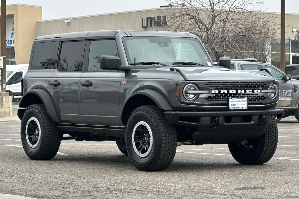 Lithia Ford and Lincoln of Fresno is pleased to offer this Carbonized Gray Metallic 2025 Ford Bronco Badlands for purchase, this vehicle is well equipped with many features including: Equipment Group 332A Mid Package (2-Door Intelligent Access w/Lock/Unlock, Ambient Footwell Lighting, Connected Navigation, Dr & Pass Illuminated Sliding Visor Vanity Mirrors, Dual Smart Charging USB Ports, Dual-Zone Electronic Automatic Temperature Control, Front Row Heated Seats, Power Outlet - Back Side of Center Floor Console, and Rear Parking Sensors), Sasquatch Graphics Package, Sasquatch Package (High Clearance Fender Flares, High Clearance Suspension, Position-Sensitive Bilstein Shock Absorbers, and Wheels: 17 Carbonized Gray Painted Aluminum), 4-Wheel Disc Brakes, 7 Speakers, ABS brakes, Air Conditioning, Alloy wheels, AM/FM radio: SiriusXM with 360L, AM/FM Stereo, Auto High-Beam Headlamps, Auto High-beam Headlights, Auto-dimming Rear-View mirror, BLIS Blind Spot Information System, Brake assist, Compass, Delay-off headlights, Door Storage Bags, Driver door bin, Driver vanity mirror, Dual front impact airbags, Dual front side impact airbags, Electronic Stability Control, Emergency communication system: 911 Assist, Engine Block Heater, Exterior Parking Camera Rear, Ford Performance Heavy-Duty Modular Front Bumper, Front & Rear Floor Liners w/o Carpet Floor Mats, Front anti-roll bar, Front Bucket Seats, Front Center Armrest, Front fog lights, Front License Plate Bracket, Front reading lights, Front wheel independent suspension, Fully automatic headlights, Hard Top Sound Deadening Headliner, Heated door mirrors, Heated front seats, Heated steering wheel, Illuminated entry, Integrated roll-over protection, Internet access capable: FordPass Connect, Lane-Keeping System, Leather Shift Knob, Low tire pressure warning, Marine Grade Vinyl Heated Bucket Seats, Occupant sensing airbag, Outside temperature display, Overhead airbag, Overhead console, Panic alarm, Passenger door bin, Passenger vanity mirror, Power door mirrors, Power steering, Power windows, Pre-Collision Assist w/Automatic Emergency Braking, Radio data system, Rear-View Camera, Rear-Window Defroster & Washer, Remote keyless entry, Security system, Shadow Black Painted Hard Top, SiriusXM w/360L, Speed control, Split folding rear seat, Steering wheel mounted audio controls, SYNC 4, Tachometer, Telescoping steering wheel, Tilt steering wheel, Traction control, Trip computer, Variably intermittent wipers, Voltmeter, Wheels: 17 Black High Gloss-Painted Aluminum (64X), and Wheels: 17 Carbonized Gray-Painted Aluminum. 4WD 10-Speed Automatic 2.7L EcoBoost V6 Badlands
