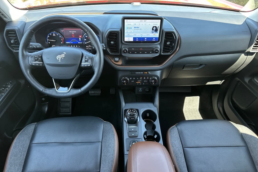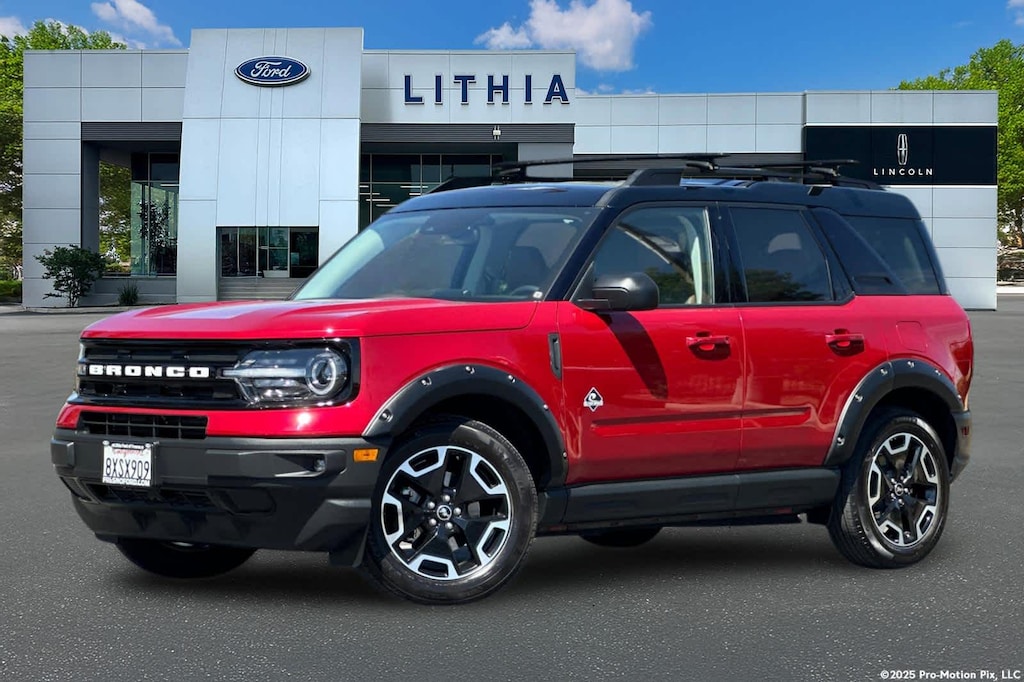 Lithia Ford and Lincoln of Fresno is pleased to offer this Rapid Red Metallic Tinted Clearcoat 2021 Ford Bronco Sport Outer Banks for purchase, this vehicle is well equipped with many features including: Equipment Group 300A, 3.80 Axle Ratio, 4-Wheel Disc Brakes, 6 Speakers, ABS brakes, Air Conditioning, Alloy wheels, AM/FM radio: SiriusXM, AM/FM Stereo, Auto High-beam Headlights, Auto-dimming Rear-View mirror, Automatic temperature control, Brake assist, Cargo Mat, Compass, Delay-off headlights, Driver door bin, Driver vanity mirror, Dual front impact airbags, Dual front side impact airbags, Electronic Stability Control, Emergency communication system: SYNC 3 911 Assist, Exterior Parking Camera Rear, Four wheel independent suspension, Front & Rear Floor Liners w/Carpet Mats, Front anti-roll bar, Front Bucket Seats, Front Center Armrest, Front dual zone A/C, Front fog lights, Front reading lights, Fully automatic headlights, Heated door mirrors, Heated front seats, Heated steering wheel, Illuminated entry, Knee airbag, Leather Trimmed Heated Sport Contour Bucket Seats, Low tire pressure warning, Occupant sensing airbag, Outside temperature display, Overhead airbag, Overhead console, Panic alarm, Passenger door bin, Passenger vanity mirror, Pocket Style Fender Flare Kit I w/Rivet (DIO), Power door mirrors, Power driver seat, Power passenger seat, Power steering, Power windows, Radio data system, Rain sensing wipers, Rear anti-roll bar, Rear Parking Sensors, Rear reading lights, Rear seat center armrest, Rear window defroster, Rear window wiper, Remote keyless entry, Roof rack: rails only, Security system, SiriusXM Radio, Speed control, Speed-sensing steering, Speed-Sensitive Wipers, Split folding rear seat, Steering wheel mounted audio controls, SYNC 3 Communications & Entertainment System, SYNC 3/Apple CarPlay/Android Auto, Tachometer, Telescoping steering wheel, Tilt steering wheel, Traction control, Trip computer, Variably intermittent wipers, and Wheels: 18 Ebony Black-Painted Aluminum. 4WD 1.5L EcoBoost 8-Speed Automatic Outer Banks