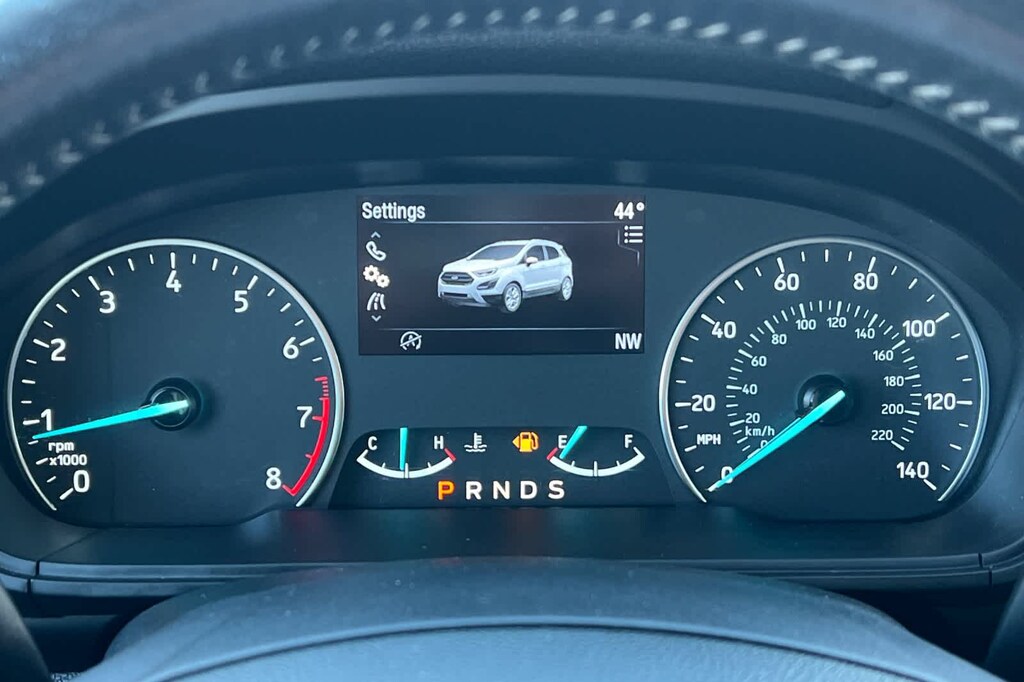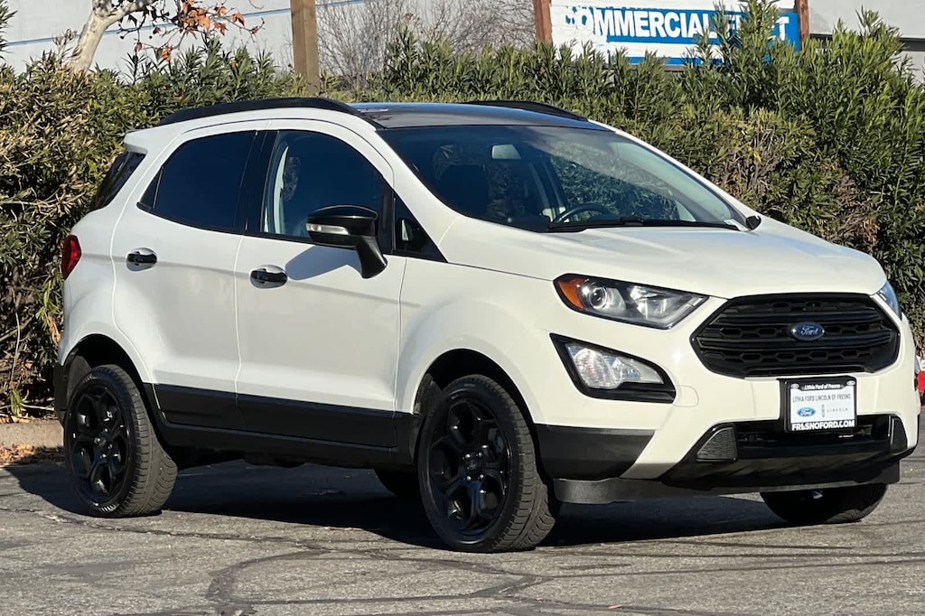 Lithia Ford and Lincoln of Fresno is pleased to offer this Diamond White 2021 Ford EcoSport SES for purchase, this vehicle is well equipped with many features including: Equipment Group 300A, 3.51 Axle Ratio, 4-Wheel Disc Brakes, 7 Speakers, ABS brakes, ActiveX Seating Material Heated Front Bucket Seats, Air Conditioning, Alloy wheels, AM/FM radio: SiriusXM, AppLink/Apple CarPlay and Android Auto, Auto-dimming Rear-View mirror, Automatic temperature control, Brake assist, Bumpers: body-color, Compass, Delay-off headlights, Driver door bin, Driver vanity mirror, Dual front impact airbags, Dual front side impact airbags, Electronic Stability Control, Emergency communication system: SYNC 3 911 Assist, Exterior Parking Camera Rear, Front anti-roll bar, Front Bucket Seats, Front Center Armrest, Front fog lights, Front License Plate Bracket, Front reading lights, Front wheel independent suspension, Fully automatic headlights, Heated door mirrors, Heated front seats, Heated steering wheel, Illuminated entry, Knee airbag, Leather Shift Knob, Low tire pressure warning, Navigation System, Occupant sensing airbag, Outside temperature display, Overhead airbag, Overhead console, Panic alarm, Passenger door bin, Passenger vanity mirror, Power door mirrors, Power driver seat, Power moonroof, Power steering, Power windows, Radio data system, Radio: AM/FM/MP3 Stereo, Rain sensing wipers, Rear anti-roll bar, Rear Parking Sensors, Rear seat center armrest, Rear side impact airbag, Rear window defroster, Rear window wiper, Remote keyless entry, Roof rack: rails only, SiriusXM Radio, SiriusXM Traffic & Travel Link, Speed control, Speed-sensing steering, Split folding rear seat, Spoiler, Steering wheel mounted audio controls, SYNC 3 Communications & Entertainment System, Tachometer, Telescoping steering wheel, Tilt steering wheel, Traction control, Trip computer, Turn signal indicator mirrors, Variably intermittent wipers, and Wheels: 17 Black-Painted Aluminum. 4WD 2.0L I4 Ti-VCT GDI 6-Speed Automatic SES
