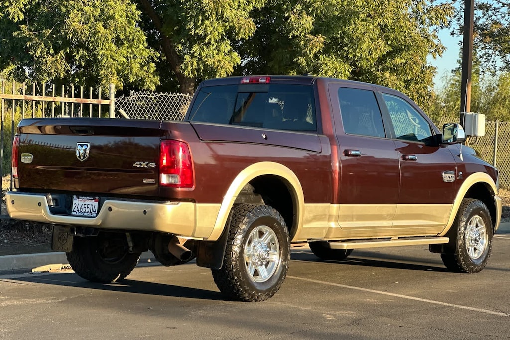 Lithia Ford and Lincoln of Fresno is pleased to offer this Deep Molten Red Pearlcoat 2012 Ram 2500 Laramie Longhorn for purchase, this vehicle is well equipped with many features including: 10 Speakers, 115V Auxiliary Power Outlet, 17 x 8 Aluminum Wheels, 3.73 Rear Axle Ratio, 4-Wheel Disc Brakes, ABS brakes, Adjustable pedals, Air Conditioning, Alloy wheels, AM/FM radio: SIRIUS, Audio memory, Auto-dimming door mirrors, Auto-dimming Rear-View mirror, Automatic temperature control, Bucket Seats, CD player, Chrome Exterior Mirrors, Compass, Delay-off headlights, Driver door bin, Driver vanity mirror, Dual front impact airbags, Dual front side impact airbags, DVD-Audio, Electronic Stability Control, Exterior Mirrors Courtesy Lamps, Exterior Mirrors w/Heating Element, Exterior Mirrors w/Memory, Exterior Mirrors w/Supplemental Signals, Exterior Parking Camera Rear, Front anti-roll bar, Front Bucket Seats, Front Center Armrest w/Storage, Front dual zone A/C, Front fog lights, Front reading lights, Fully automatic headlights, Garage door transmitter, Genuine wood dashboard insert, Genuine wood door panel insert, Heated door mirrors, Heated Front Seats, Heated front seats, Heated rear seats, Heated Second Row Seats, Heated Steering Wheel, Heated steering wheel, Illuminated entry, Leather steering wheel, Locking Tailgate, Low tire pressure warning, Memory seat, Navigation System, Occupant sensing airbag, Outside temperature display, Overhead airbag, Overhead console, Panic alarm, Passenger door bin, Passenger vanity mirror, Pedal memory, Power 10-Way Memory Driver & 6-Way Passenger Seats, Power door mirrors, Power driver seat, Power Lumbar Adjust, Power passenger seat, Power steering, Power windows, Premium Leather Bucket Seats, Radio data system, Radio: Uconnect 730N CD/DVD/MP3/HDD/NAV, Rear 60/40 Split Folding Seat, Rear Parking Sensors, Rear seat center armrest, Rear step bumper, Remote keyless entry, Security system, Speed control, Split folding rear seat, Steering wheel mounted audio controls, Tachometer, Tilt steering wheel, Traction control, Trip computer, Turn signal indicator mirrors, Variably intermittent wipers, Ventilated Front Seats, Ventilated front seats, and Voltmeter. 4WD Cummins 6.7L I6 Turbodiesel 6-Speed Automatic Laramie Longhorn